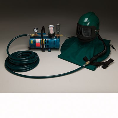 完整供一人使用的噴砂頭盔系統(tǒng)包括一個Nova頭盔、低壓流量適配器、3/4HP呼吸空氣泵和50'低壓氣管。