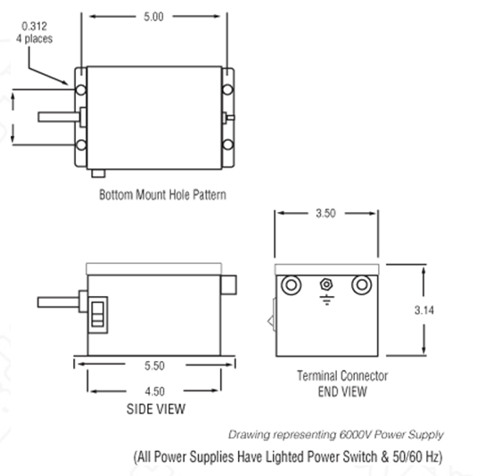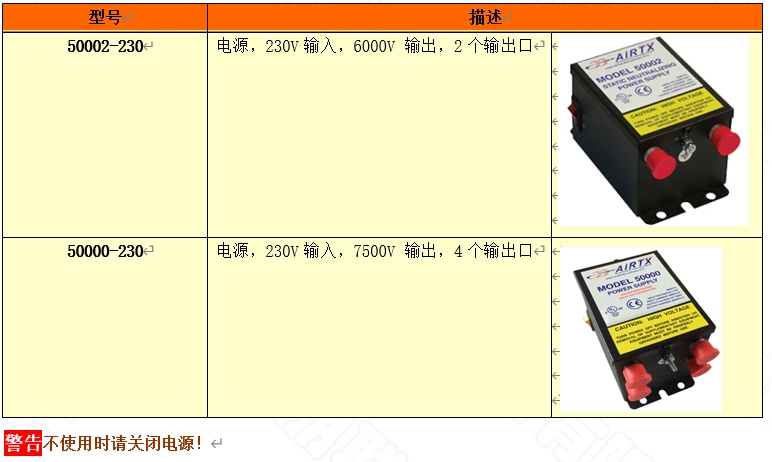 美國AIRTX提供6000V(型號50002-230)和7500V(型號50000-230)高壓電源。其中6000V電源比常規(guī)的5000V電源多產(chǎn)生20%中和離子,7500V電源比5000V電源多產(chǎn)生50%的中和離子。